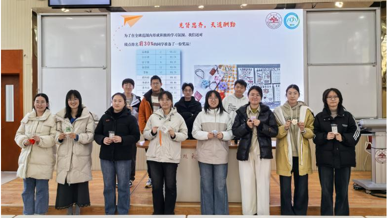 班会伊始,商钧皓就本学期的重点工作进行了全面部署。内容涵盖学业提升计划、班级文化建设以及各类实践活动安排等方面,为班级后续工作的有序开展锚定方向,鼓励了同学们以积极的态度和饱满的热情投入新学期的学习与生活中。随后,为表彰先进,商钧皓对在大一上学期期末备考打卡活动前五名的同学,以及期末成绩进入前30%的同学进行了公开表扬与奖励,在班级内营造了浓厚的学习氛围。