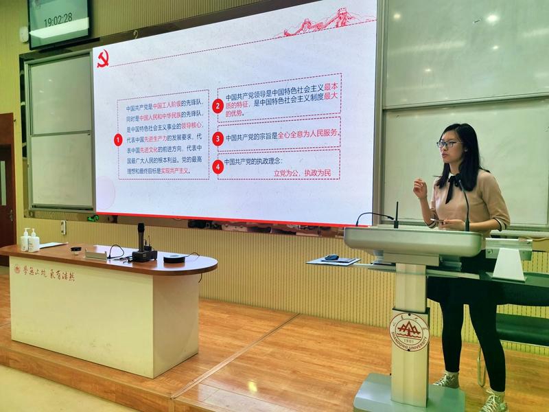 19时整,讲座准时开始。本次讲座分为三部分:讲述中国共产党核心内涵,梳理中国共产党历史大事件,观看电影《建党伟业》。在宣读完中国共产党的基本纲领、特征优势、服务纲领、执政理念之后,杜雨结合中国共产党成立一百周年庆祝活动标识,深挖细节,与同学积极互动,科普标识中构图要素的寓意。随后,从中国共产党第一次全国代表大会到党的十九届四中全会,杜雨将党的历史大事件分为七个阶段逐层进行讲解,让同学们对党的发展有了更加深刻的认识。在观看电影《建党伟业》时,全体同学全程静默,认真学习。影片展现了中国共产党在内忧外患中诞生,在磨难挫折中成长,在攻坚克难中壮大的光辉历程,这引起了同学们的强烈反响。电影结束后,同学们积极讨论党的历史,思考党的历程。