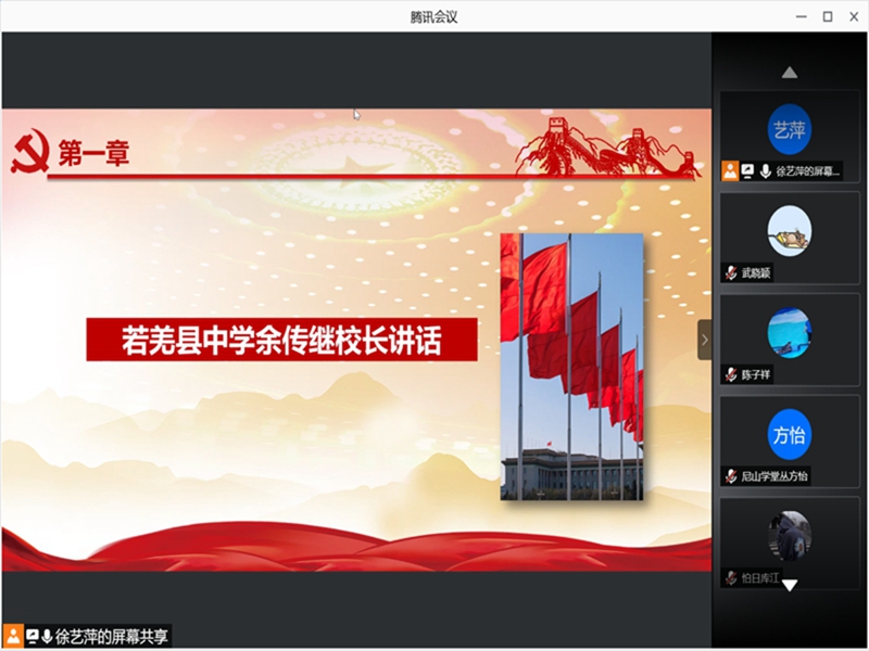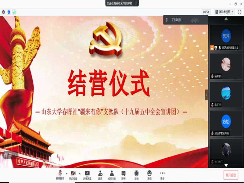 2月7日,山东大学春晖社“疆来有你”支教队于线上举办了结营仪式。队长徐艺萍担任主持人,若羌中学校长余传继、李攀攀出席了此次会议,若羌中学七、八年级学生、家长以及全体支教队员参加。