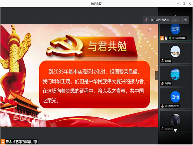 最后,徐艺萍队长以十九届五中全会精神与诸君共勉。尽管寒冬封锁了春意,疫情阻断了相见,但跨越万水千山的爱绝不会被隔断。春晖已至,严冬不寒,万里同心,愿“疆来有你”。