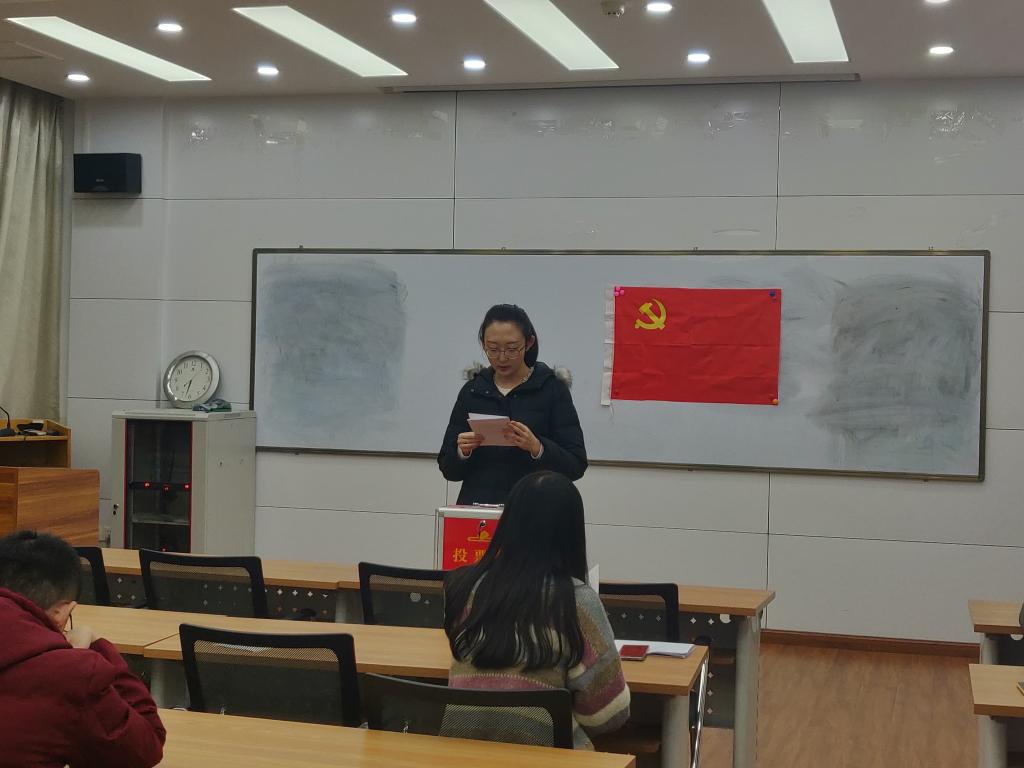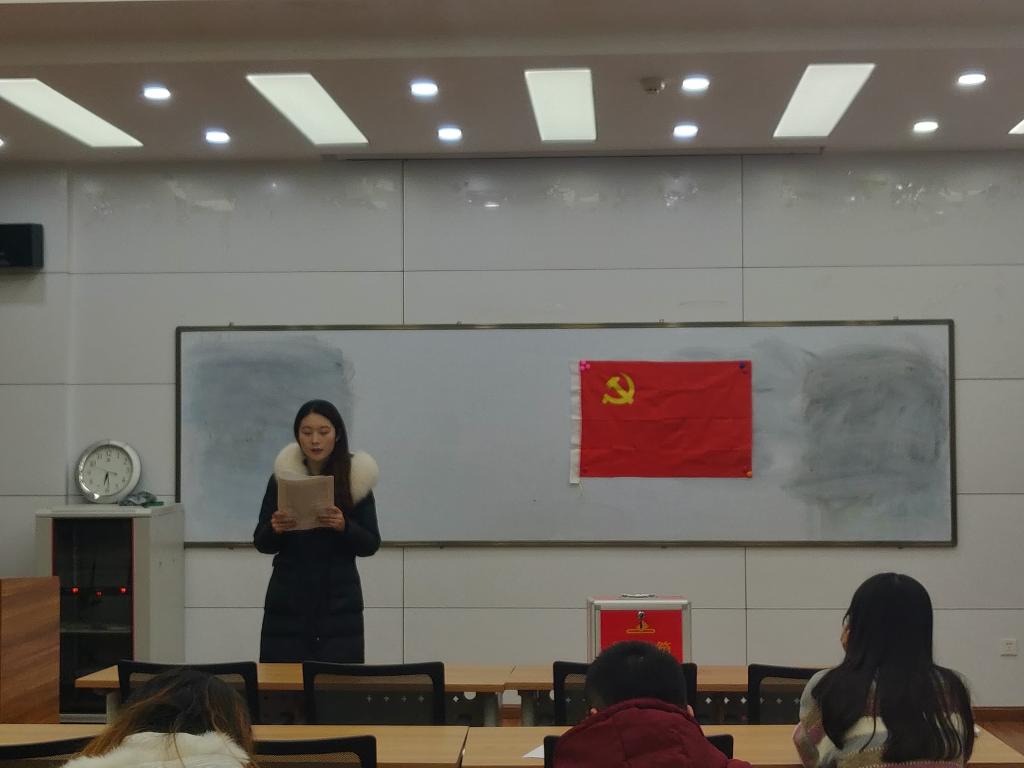 会议第二项为讨论接收李莹爽为预备党员。首先李莹爽宣读了《入党志愿书》,入党介绍人介绍了李莹爽的主要情况,组织委员姚卜凡向大会报告了支委会对李莹爽的审查情况。最后大会进行讨论,与会党员充分发表意见。大会通过无记名投票,接收李莹爽为预备党员。李莹爽同志进行了表态。