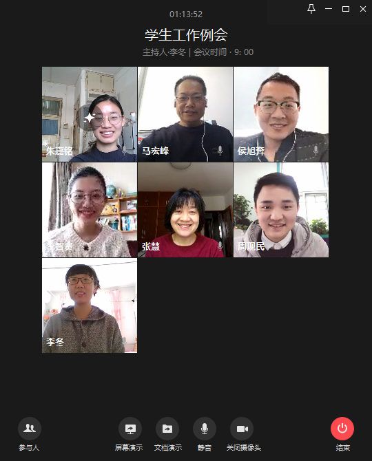 4月27日上午,新利体育学生工作队伍利用企业微信平台召开视频工作例会,交流上周工作成果,研判当前学生工作形势,部署下周工作安排。会议由党委副书记马宏峰主持,党委副书记张慧及全体辅导员参会。