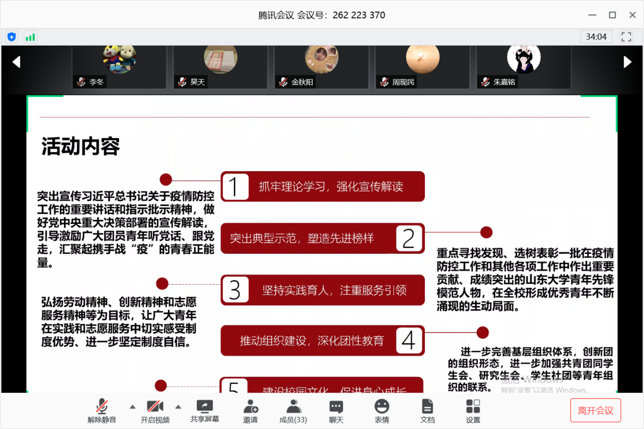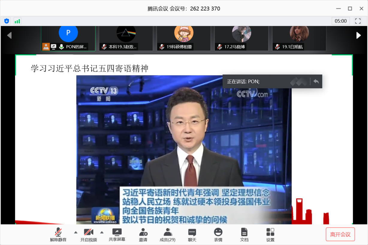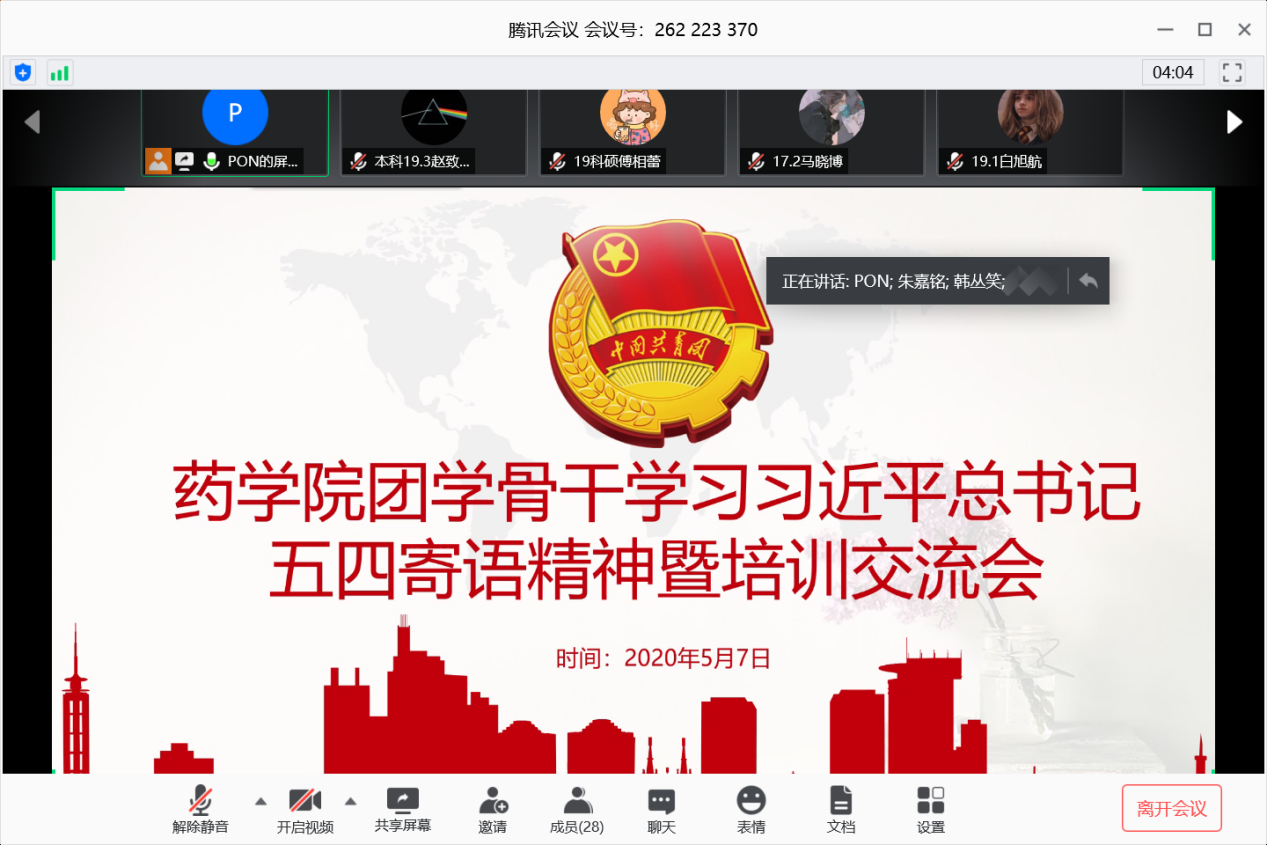 首先,与会成员集体学习了习近平总书记五四寄语精神,分享学习体会,共话青春担当。2019级科硕班团支书傅相蕾分享道:“作为医药学科研究生,扎根专业领域,投身实用科研,才能为做好健康中国梦这场接力赛的传递者而奋斗。”2015级临床药学班团支书韩丛笑谈到:“我们要进一步发挥团支部的堡垒作用和凝聚力,协助学院做好各项工作,为同学们渡过特殊时期保驾护航。”2016级临床药学班团支书张馨方感慨:“习近平总书记的寄语是对青年一代的殷切希望,我们将以习近平总书记寄语精神为指引,传承五四精神,砥砺前行,争做新时代担当有为的青年人。”2017级药学二班团支书马晓博谈到:“在疫情中,青年人用实际行动证明自己是好样的,接下来我们也会牢记书记嘱托,勇担时代使命。”2018级临床药学班团支书王湘月结合团支部工作,探讨了同学们在疫情期间学习上、生活上遇到的问题。2019级药学一班团支书白旭航分享道:“今年的五四是2019级学生进入我校校园后的第一个五四青年节,同学们开始真正地以一个青年人的姿态来审视自我,要求自我。作为青年的我们一定要直面挑战,主动化解问题和困难,在真抓实干中不断发展,在真学真练中不断成长。”随后白旭航、王湘月、林行刚分别从团支部、社团、学院层面分享了素质拓展培养系统的操作流程及注意事项。