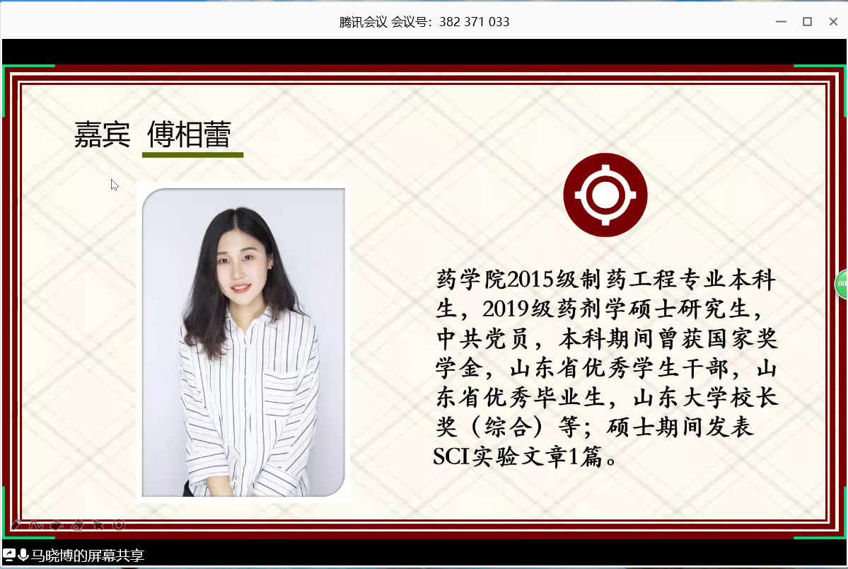 接下来是傅相蕾的分享,她从专业选择、支教经历、实习经历几个方面进行展开,鼓励各位同学能做好选择,建设小我,成就大我。