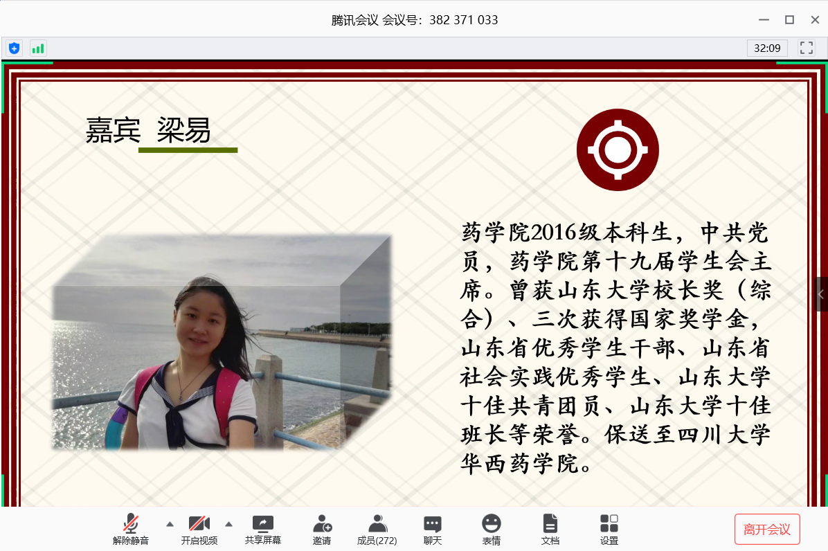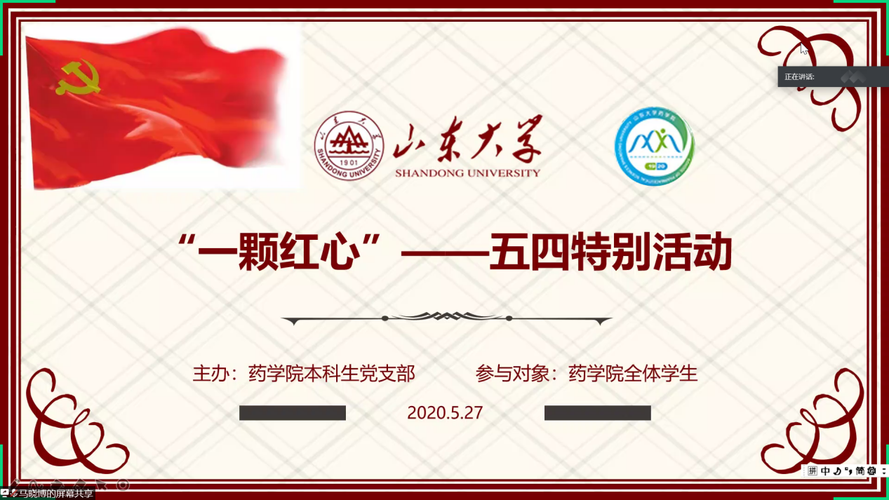 2020年5月27日,“一颗红心”五四特别活动于腾讯会议线上平台举办。本次活动由马晓博主持,2019级研究生傅相蕾、聂爱清,2016级本科生王昊天、潘梓路、梁易作为本场活动的嘉宾,向大家进行大学期间学习生活经验经历分享以及在母校成长的感悟体会。