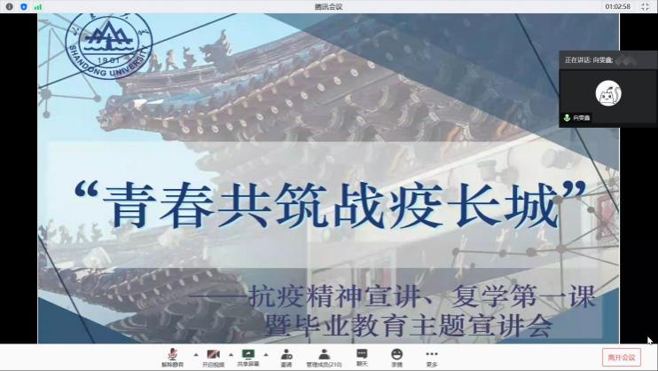 2020年6月4日晚,新利体育于腾讯会议和WeLink平台举办了“青春共筑战疫长城”——抗疫精神宣讲、复学第一课暨毕业教育主题宣讲会,邀请山东大学齐鲁医院重症医学科护士长、第四批援鄂医疗队队员、硕士生导师周敏,山东大学校团委拓展培养认证服务中心部长阮佳程,山东大学自强之星、我院2015级本科生向雯鑫进行宣讲。新利体育全体本科生参与了本次活动。