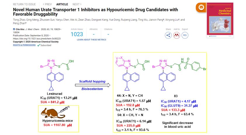 近日,刘新泳、展鹏教授团队以人尿酸转运蛋白1(URAT1)为靶标,以雷西纳德为先导化合物,通过同源建模及多药物化学策略,并参考现有URAT1抑制剂的药效团特征,设计、合成并评价了一百余个全新结构的小分子化合物。同时构建了稳定的小鼠高尿酸血症模型,对所设计合成的化合物进行了体内活性测试。发现21个化合物能够显著降低小鼠体内尿酸水平,其中化合物44、54、83体内活性为上市药物雷西纳德的4倍。进一步的体外实验研究表明,候选药物44的靶点抑制活性是雷西纳德的8.4倍(IC50: 1.57 μM vs. 13.21 μM)。同时,候选药物83对尿酸重吸收协同蛋白葡萄糖转运体9(GLUT9)亦表现出明显抑制活性(IC50= 31.73 μM),此类双靶点抗痛风化合物尚未见广泛报道。另外,44、54、83三个候选药物在成药性方面均展现出良好类药性,其生物利用度分别为76.3%、93.6%、63.4%。三个候选药物在急性毒性、亚急性毒性、CYP酶抑制实验以及Herg毒性中都明显优于上市药物雷西纳德。综上,上述三个化合物均为有潜力的抗痛风候选药物。