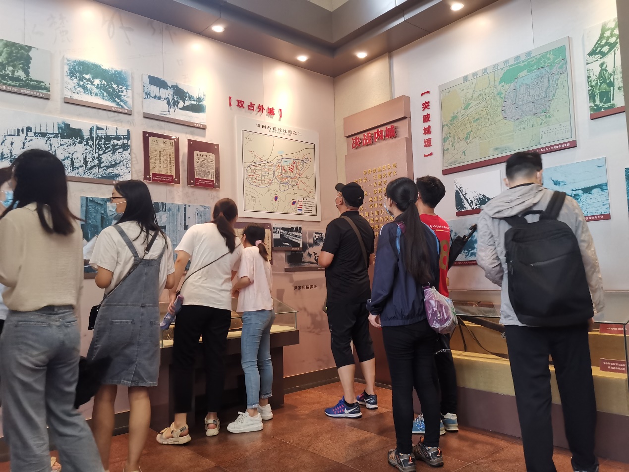 上午十点半,党员同志们冒雨在解放阁前集合,雨中的解放阁庄严肃穆,大家拾阶而上,怀着无比崇敬的心情参观了纪念大厅和观瞻厅。看到那些沧桑厚重的革命展品、旧址中可歌可泣的革命事迹,济南战役的过往便渐渐浮现于各位党员的脑海。73年前的济南战役,华东人民解放军山东兵团经过8昼夜连续作战,以伤亡2.6万人为代价,换回了这座城市的永久和平。1963年,济南市利用原内城东南城角,砌筑台基,以纪念1948年济南战役的胜利。80年代初,中共济南市委、市政府决定在台上建阁,以缅怀革命先烈。当历史的年轮铭刻上革命先烈和新时代奋斗者的足迹,各位党员同志也更充分认识到学习先烈精神,传承革命薪火的重要性。