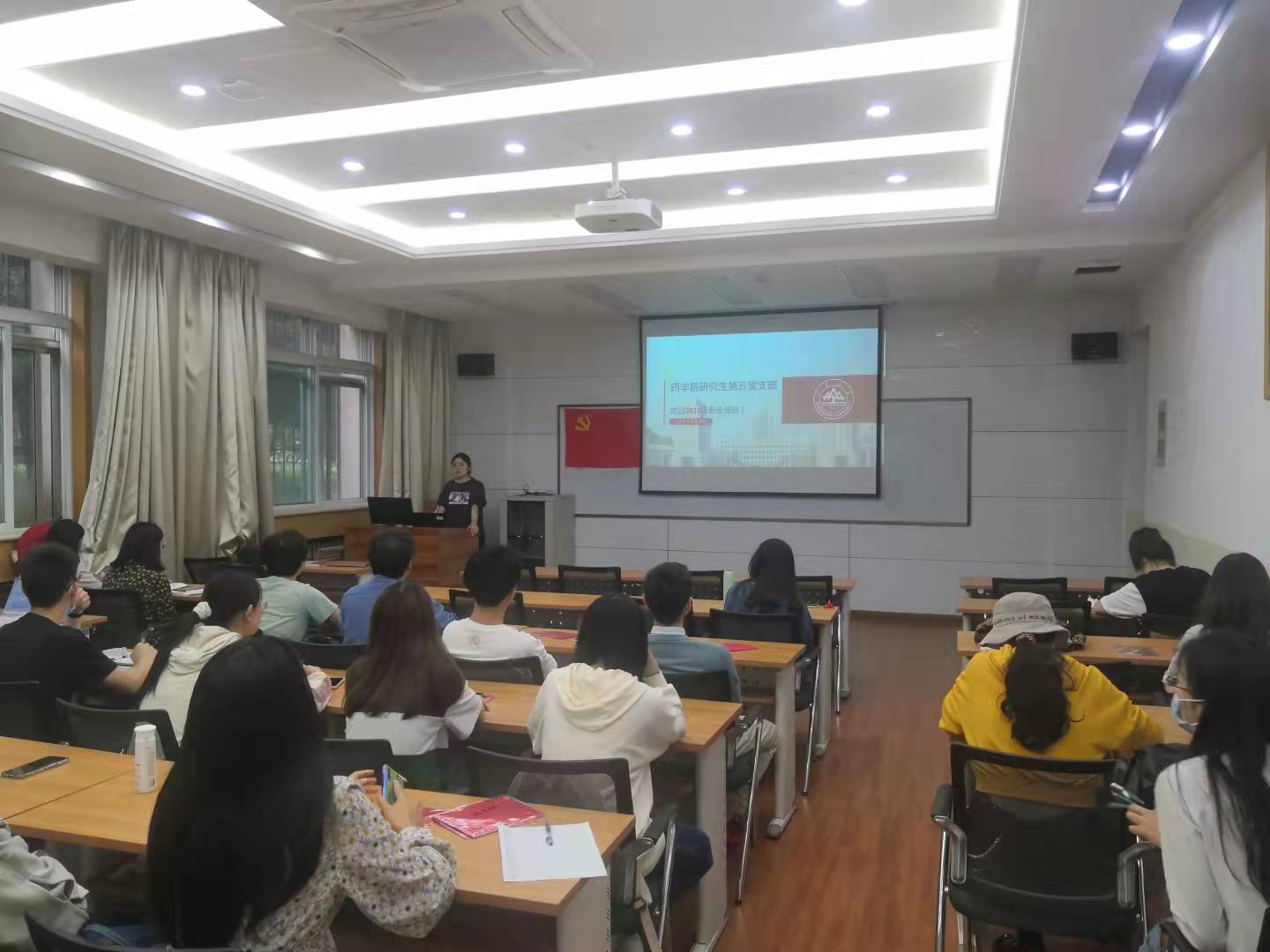 会议伊始,支部书记聂爱清同志从党支部情况、支部工作以及支部发展全面介绍了研究生第五党支部的情况。她指出,第五党支部作为学校的研究生样板党支部,一直以来都是一个团结互助的大家庭,在这里临床药学,药理学和免疫药物学三个专业各位党员互帮互助,共同成长。在各位党员的不懈努力下,支部不断克服困难,逐步成长。“标”“新”“力“”谊“是第五党支部的特色。明确的标准,让”党员发展“有据可依,”三会一课“有制可循;创新的形式,让院系融合,师生共建成为党日活动新典范;深厚的情谊,让每位党员都深切感受党支部最有温度的关怀。