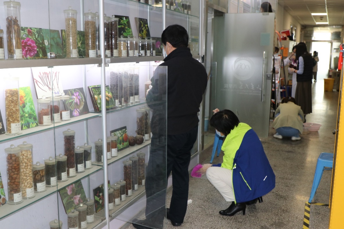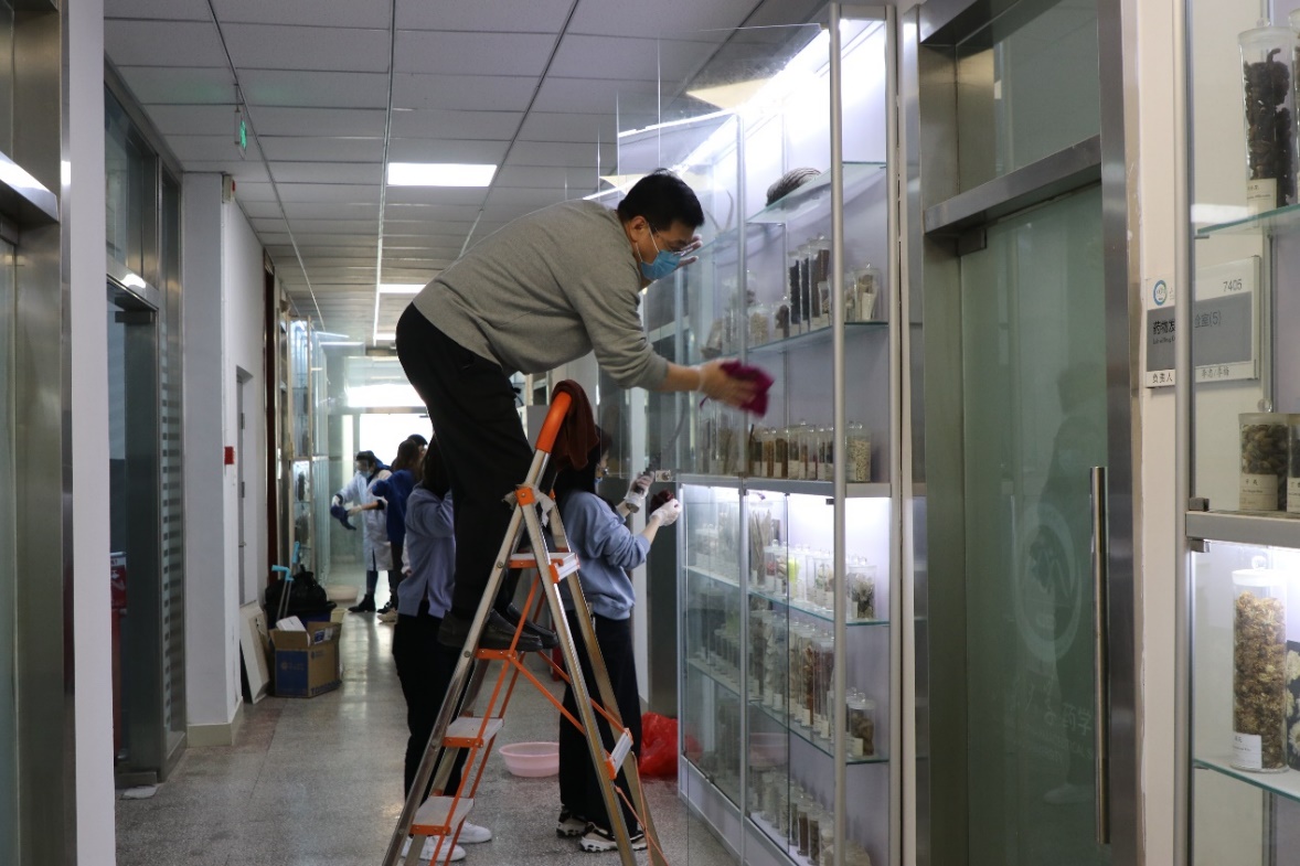 党员们首先来到趵突泉校区教学7号楼,经过简单分工,大家对位于该楼4层的中药标本展览橱进行擦拭。大家一边认真擦拭每一个展柜,一边交流劳动的感受和收获。经过一个多小时的辛勤努力,所有橱窗展柜焕然一新。大家一致认为,积极为学院做一些力所能及的事情,是行政党支部践行党的宗旨的重要体现,也是把党史学习教育成果转化为党员群众看得见、摸得着的实际成效的重要实现方式。