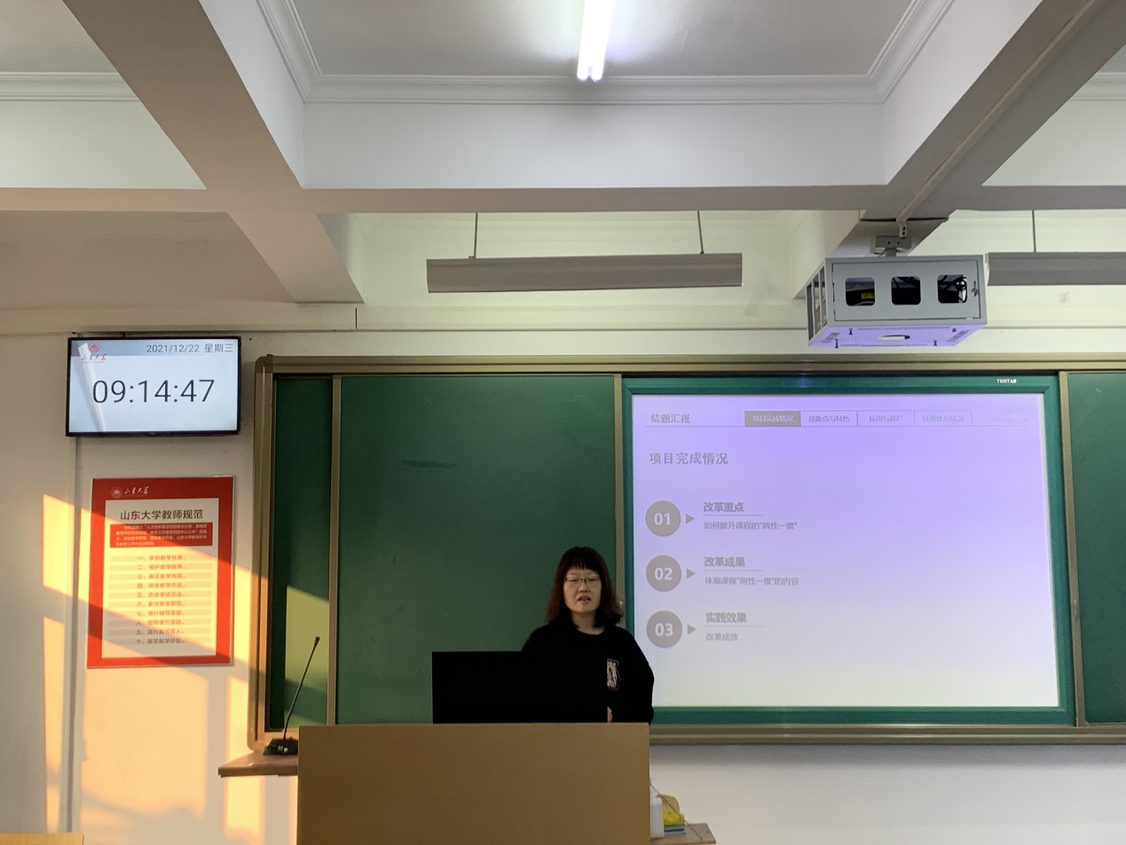 会上,教改项目负责人郝国祥老师以“形成性评价在合理用药选修课程中的应用对策研究”为题,从项目总体进展、项目完成情况、成果应用推广情况、经费使用情况等方面,系统介绍了项目完成情况;刘秀美老师从教学内容的创新、教学形式的创新、教学考核的创新三个方面出发,介绍了“基于两性一度的工业药物分析线上金课建设”的项目特色,即通过虚实结合的虚拟仿真和生产现场教学来提高学生对真实药品生产过程和设备等的感性认识,着眼于金课“两性一度”的金标准,从教学目标、教学内容、教学设计和考核评价等方面进行一致性设计。