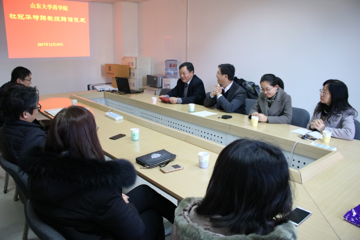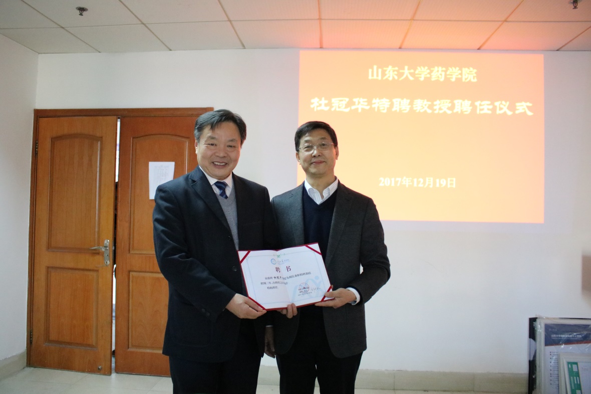 12月19日,新利体育在趵突泉校区举行聘任仪式,聘请中国医学科学院、中国协和医科大学药物研究所原副所长、国家药物筛选中心主任杜冠华研究员为特聘教授。新利体育院长刘新泳主持聘任仪式并为杜冠华颁发聘书,学院相关学科带头人参加聘任仪式。
